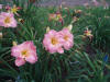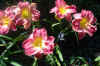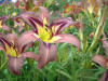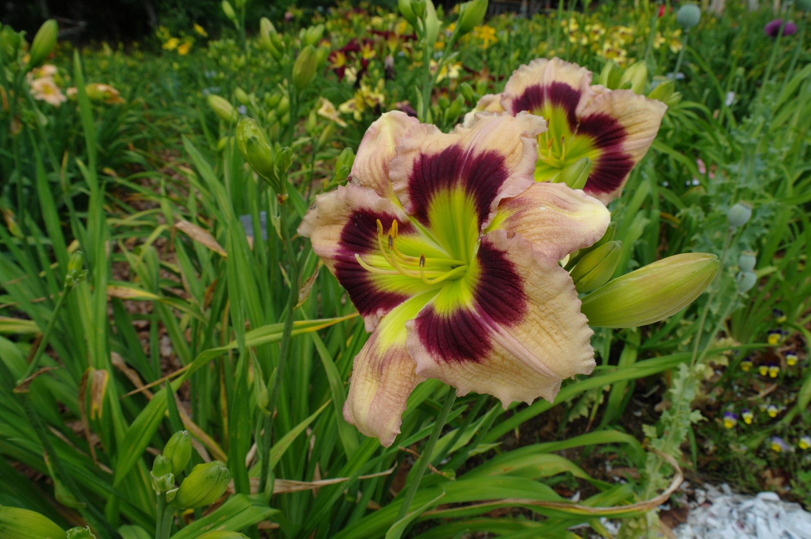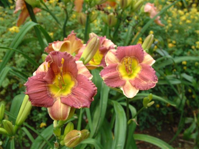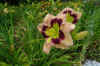 Cream pink with plum eye and edge above yellow