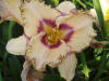 beige with a purple eyezone and edges above a yellow to green throat.