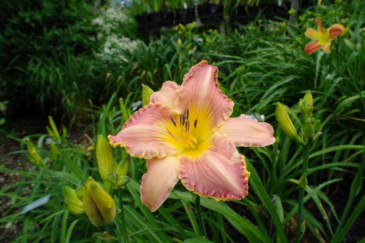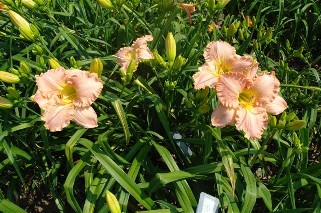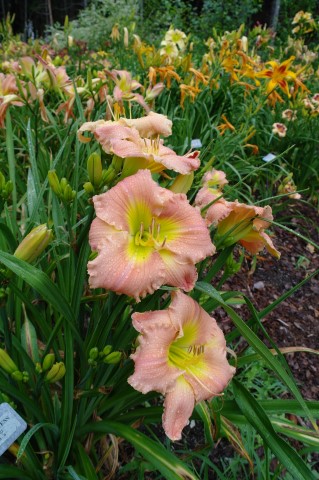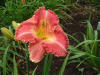 Mason M | 2007 | Sev | M | 28 | 5 | Bright coral rose pink with pale coral watermark above avocado green throat. (Old Field Coral Bisque × Ferengi Gold) | ||