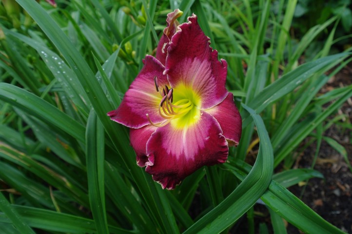 Aucoin-Derrow | 2012 | Sev | E | 27 | 6 | Crimson with green throat blending to white and then to pink watermark, white ruffled edge on petals and sepals. (Board of Directors x Executive Decision) | ||