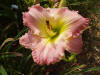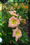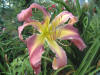 Spider 4.40:1 | Mahieu | 2003 | Dor | M | 43 | 7 | Flesh pink with light purple chevron eye above lemon chartreuse throat. [(Orchid Corsage × . citrina) × Tennessee Flycatcher)] | |