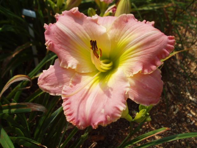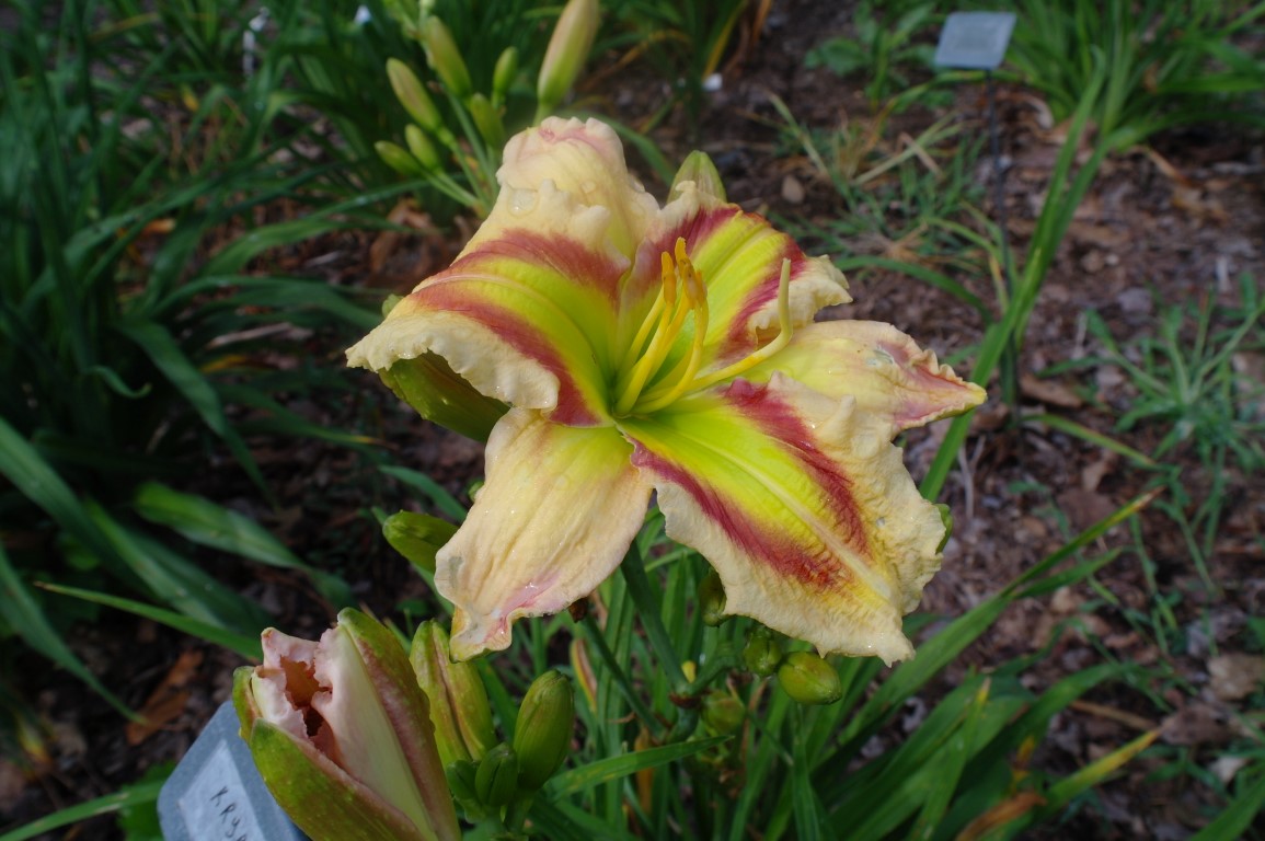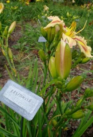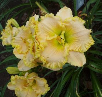Grace L | 1999 | Ev | M | 24 | 5 | Fragrant. Light yellow pink blush blend with gold ruffled edge above green throat. (Surprises Inside x sdlg) | SM 2010 AM 2007 HM 2004 JC 1999 |