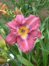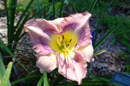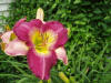 mauve with violet blue watermark above lemon green throat. (Vertical