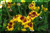 gold with black wine eye and ruffled edge above green throat. (Dragon