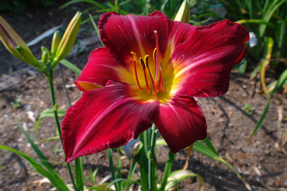 Very difficult to capture the glow from this flower with a camera. | Oakes | 1984 | Dor | M | 30 | 7 | Clear candle red self with gold yellow throat. | AM 1994 HM 1989 Lenington 2004 |