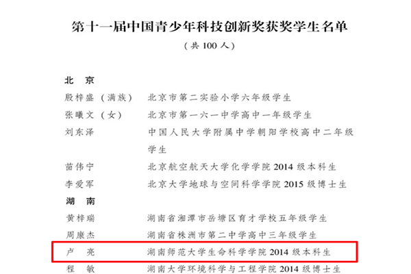 (通讯员 高惠娟 闫一轩)近日,第十一届中国青少年科技创新奖颁奖大会在北京人民大会堂举行。我校生命科学学院2014级本科生卢亮荣获第十一届中国青少年科技创新奖,这是我校本科生首次获此奖项。