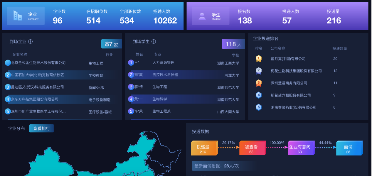 通过96家知名企业的共同支持,以及同学们的积极参与,本次线上招聘会圆满举办。我们期望同学们在本次招聘会中能找到满意的工作,也希望同更多的企业达成长期且深度的合作。