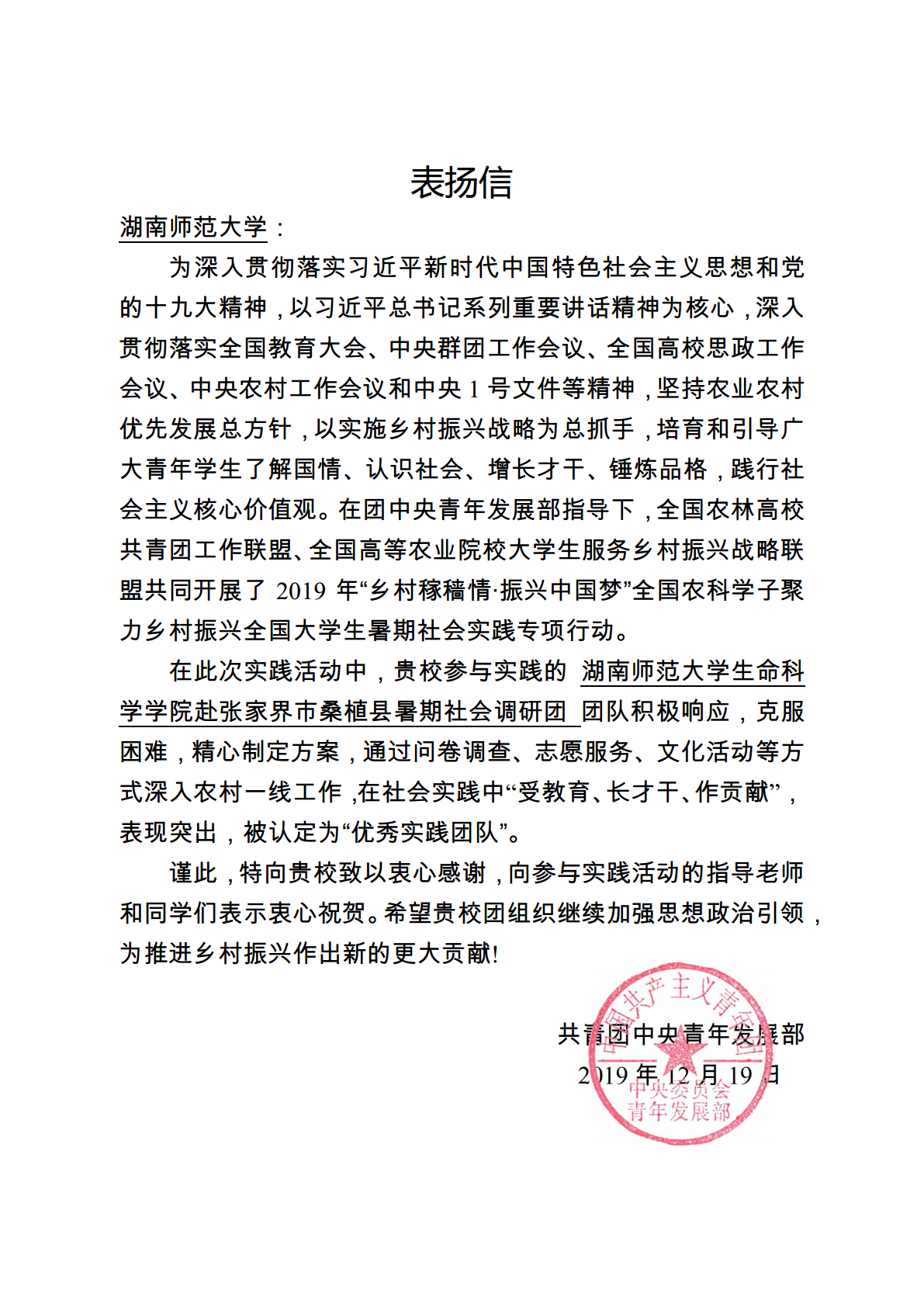(通讯员 王洋 丁翔)近日,我院赴张家界市桑植县暑期社会调研团在2019 年“乡村稼穑情 振兴中国梦”全国农科学子聚力乡村振兴全国大学生暑期社会实践专项行动中,受共青团中央青年发展部表彰,获评“优秀实践团队”。