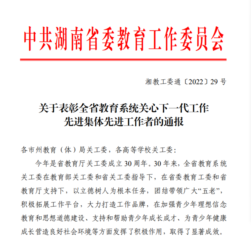 近日,省委教育工委印发《关于表彰全省教育系统关心下一代工作先进集体先进工作者的通报》,表彰了一批全省从事关心下一代工作的先进集体和个人。我校共有6个集体、12名个人获奖,实现五大奖项全覆盖。其中,我院关工委获得“先进集体”表彰,院关工委常务副主任陈业爱老师获先进工作者。