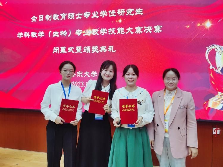 (通讯员 梁小星 刘阳)9月27日,2023年全国“田家炳杯”全日制教育硕士学科教学(生物)专业教学技能大赛于鲁东大学顺利举行。我院2022级研究生刘阳、谢小望荣获一等奖,吕艳婷荣获二等奖,段巍、戴国老师荣获优秀指导老师。