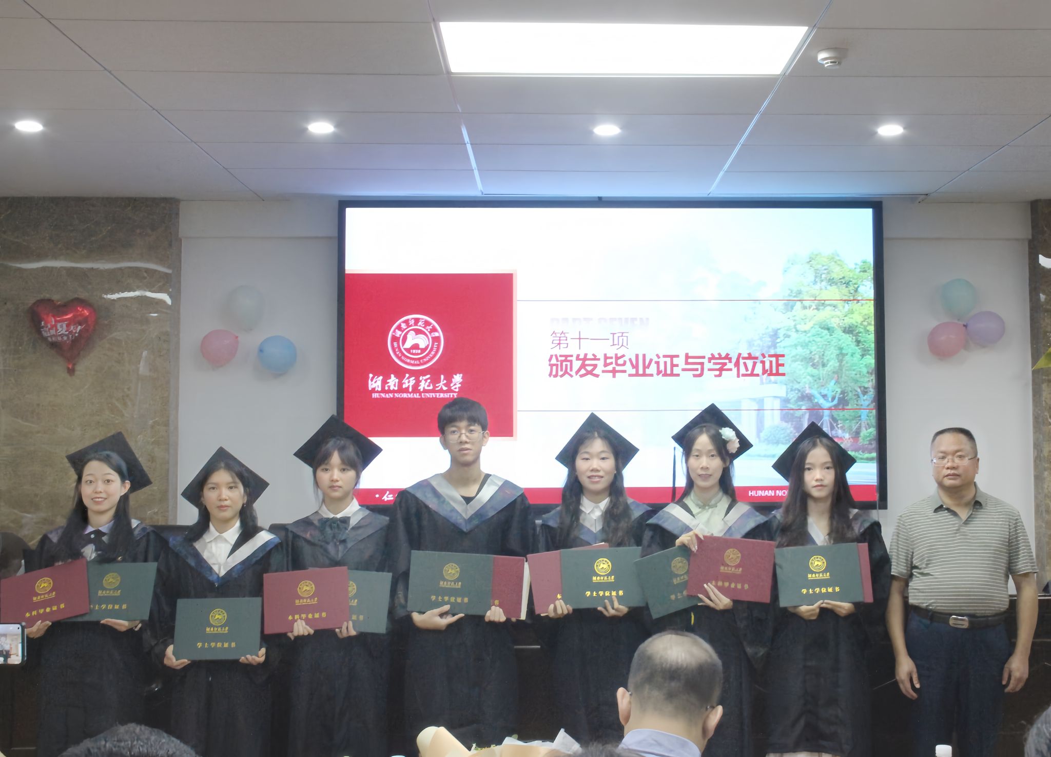 罗静伟宣读对生科院2024届优秀毕业生以及优秀毕业论文的表彰决定,蒋能胜、彭赛丰分别为省级、校级优秀毕业生们颁发荣誉奖状,彭赛丰为优秀毕业论文获得者颁发奖状。李云龙向生科院校友联络员颁发聘书,谢罗庚为优秀学生代表颁发毕业证和学位证并进行合影。