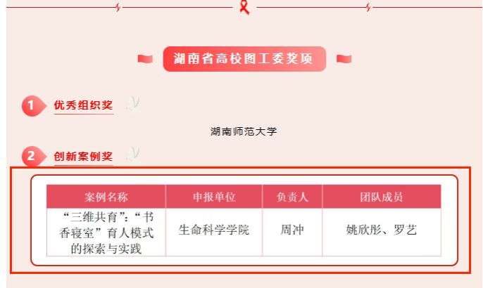 集体奖项中,刘迎彬老师指导的2024级生物科学(师范)三班荣获湖南省教育厅“书香班级奖”一等奖;学院申报、周冲老师牵头,姚欣彤与罗艺协作完成的《“三维共育”:“书香寝室”育人模式的探索与实践》案例,成功获评湖南省高校图工委“创新案例奖”。个人奖项方面,赵洛希同学斩获湖南省教育厅“优秀读书报告奖”二等奖,一众佳绩尽显我院师生深耕阅读、以读修心的良好风貌。