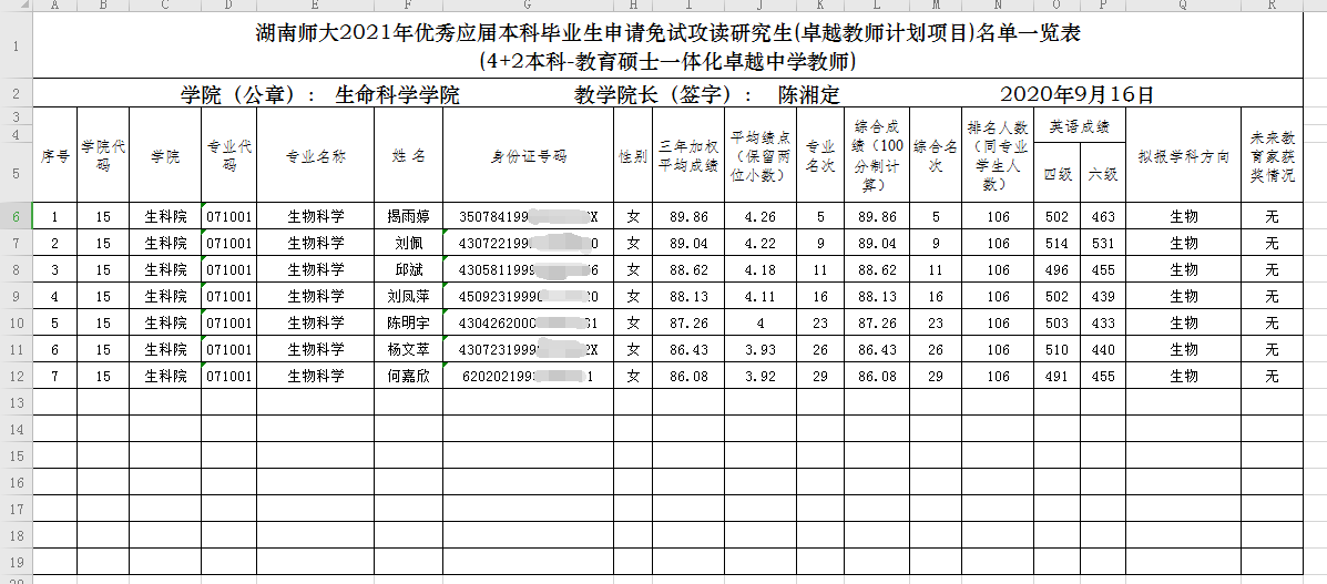 现将湖南师大2021年优秀应届本科毕业生申请免试攻读研究生(卓越教师计划项目)(4+2本科-教育硕士一体化卓越中学教师)向学校推荐面试名单进行院内公示,公示截止时间为2020年9月17日12:00,有疑问的学生须在截止时间前向学院教务办(0731-88872526)反馈。