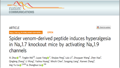 5月8日,Nature子刊,校定SCI-TOP期刊《自然通讯》(Nature Communications)在线报道了我校生命科学学院动物多肽药物创制国家地方联合工程实验室刘中华教授课题组与中国科学院脑科学与智能技术卓越创新中心(神经科学研究所)/华中科技大学生命科学与技术学院刘静宇教授课题组合作发表的题为Spider venom-derived peptide induces hyperalgesia in Nav1.7 knockout mice by activating Nav1.9 channels的研究论文。
