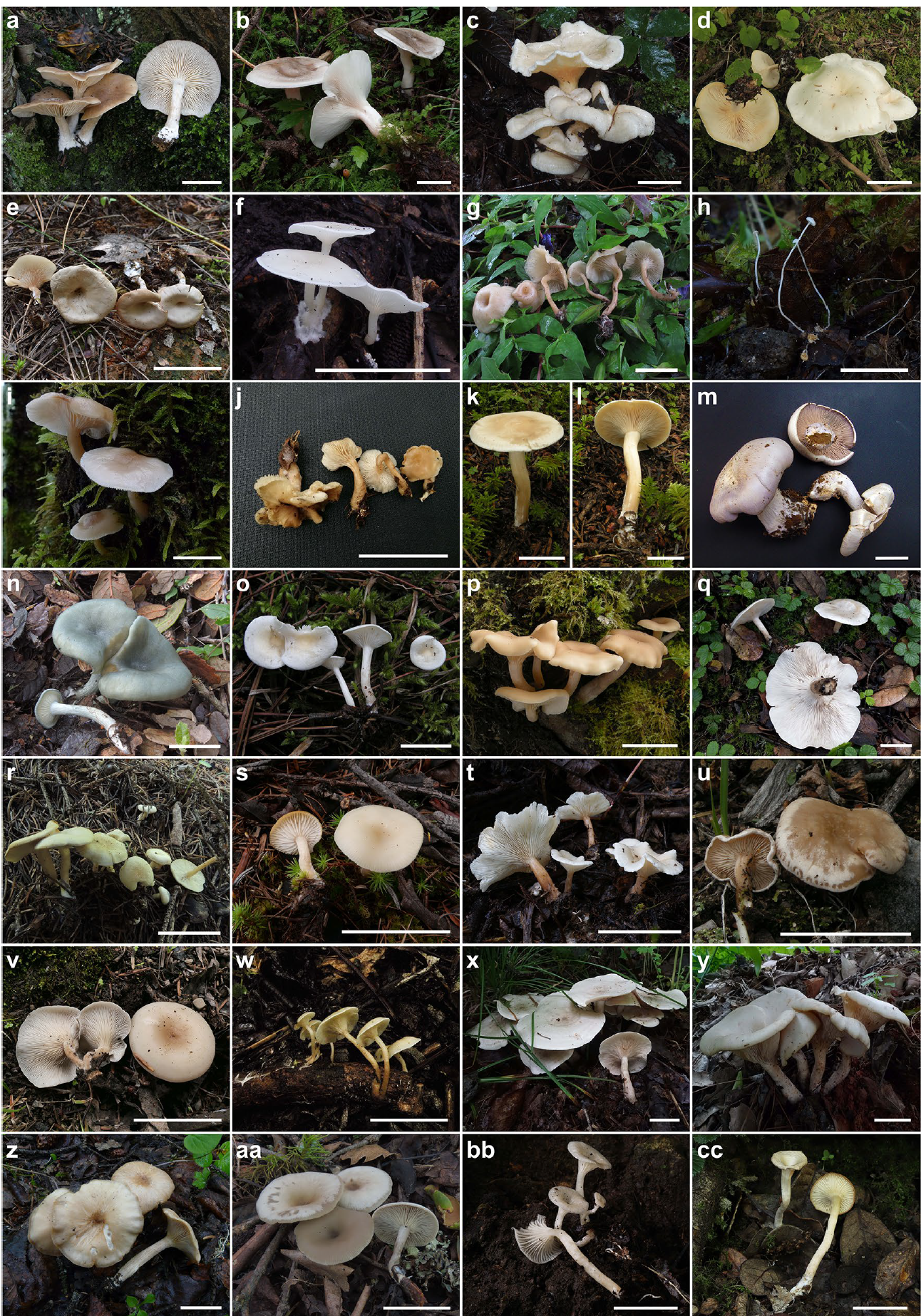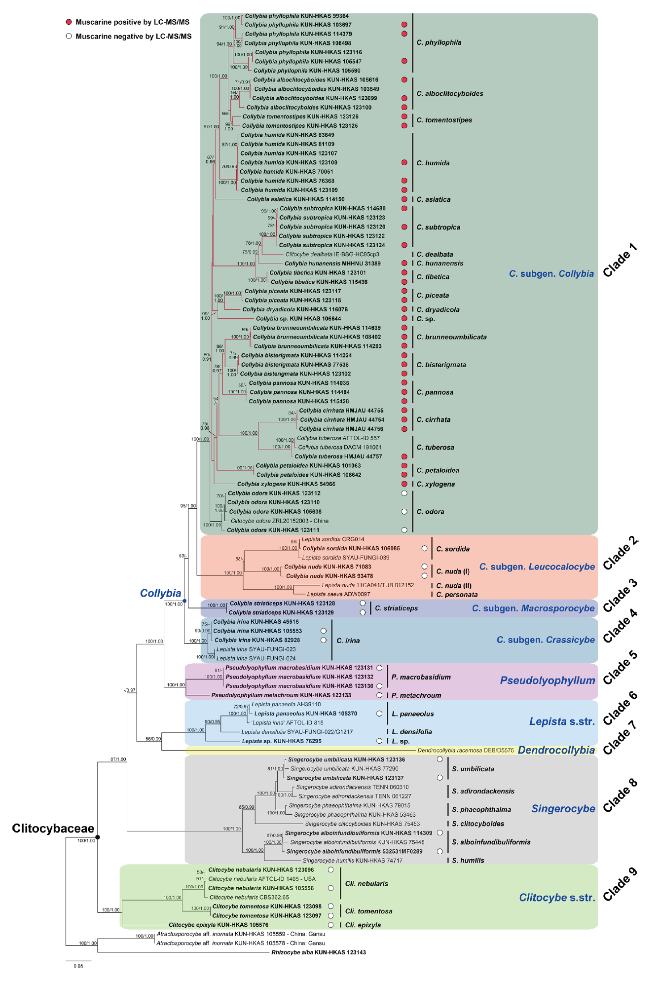 为了解决上述科学问题,何正蜜从湖南师范大学生命科学学院博士毕业后前往中国科学院昆明植物研究所从事博士后科研工作(2019-2022年),在合作导师杨祝良研究员的指导下对杯伞科进行了系统研究。基于分子系统发育、外观形态、显微结构、生境生态、毒素成分和演化时间证据,(1)更新了杯伞科的分类组成系统(6属):杯伞属(Clitocybe)、金钱菌属(Collybia)、树状金钱菌属(Dendrocollybia)、香蘑属(Lepista)、假离褶伞属(Pseudolyophyllum)和囊泡杯伞属(Singerocybe);(2)揭示了毒蕈碱毒素(Muscarine)在杯伞科中的起源和分布:毒蕈碱在该科内呈单系分布,仅经过一次独立演化,大约在两千万年出现,并且未发生丢失,为有毒金钱菌的一个共衍征;(3)挖掘了我国杯伞科物种的多样性,发表17新种和15新组合,其中19种有毒。