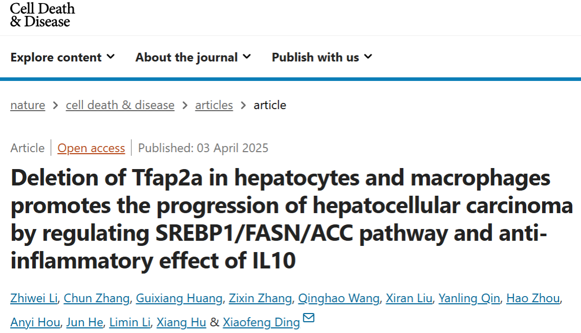 近日,湖南师范大学生命科学学院动物多肽药物创制国家地方联合工程实验室丁小凤教授团队以“Deletion of Tfap2a in hepatocytes and macrophages promotes the progression of hepatocellular carcinoma by regulating SREBP1/FASN/ACC pathway and anti-inflammatory effect of IL10”为题,在中科院1区刊物《Cell Death & Disease》(IF: 9.6)上发表最新研究成果,首次系统揭示转录因子AP-2α在肝细胞和巨噬细胞中调控脂质从头合成及炎症反应,在原发性肝细胞癌(HCC)中的关键作用与机制。