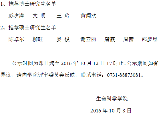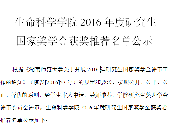 生命科学学院2016年度研究生国家奖学金获奖推荐名单公示