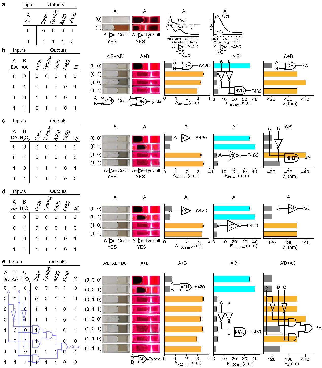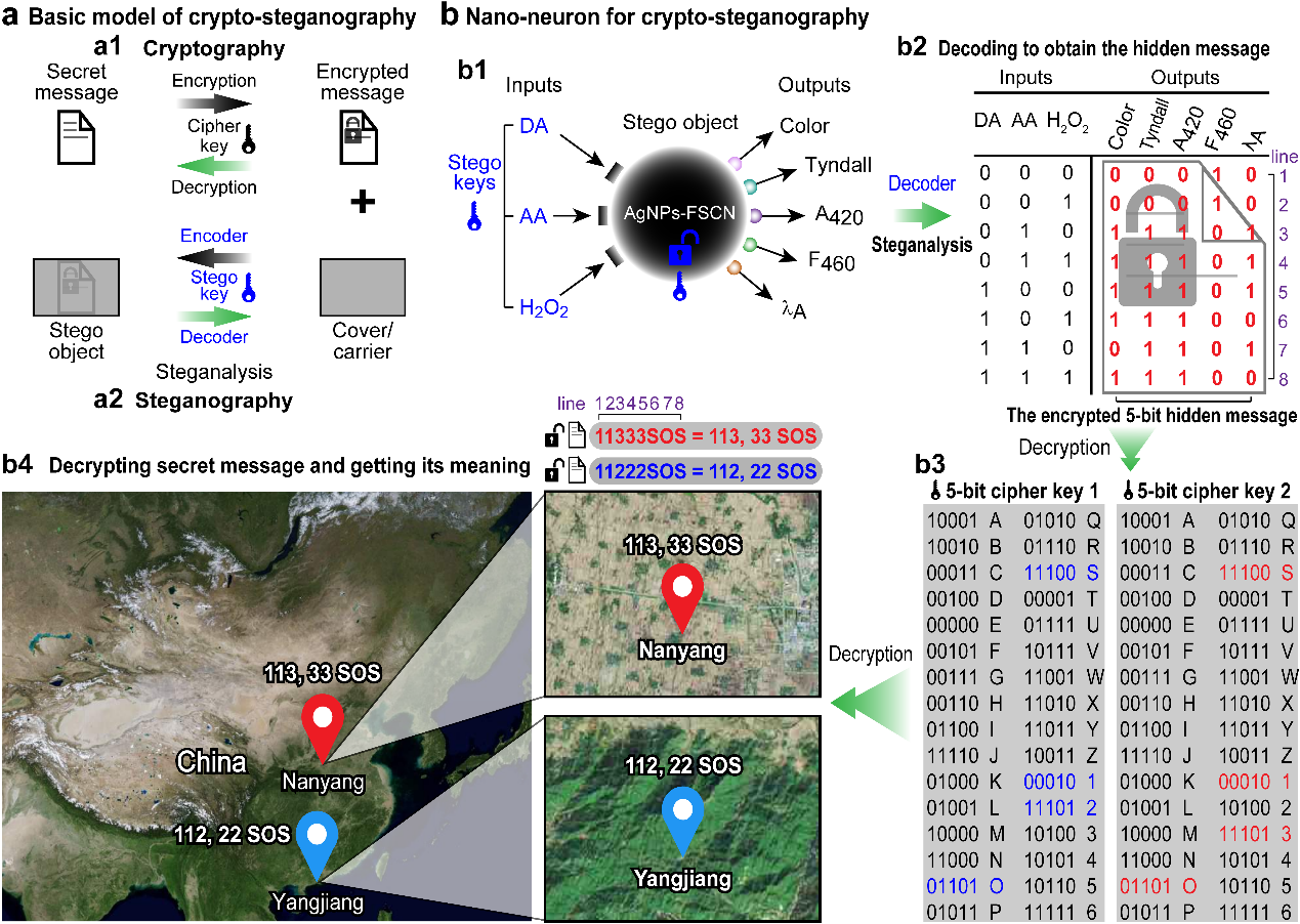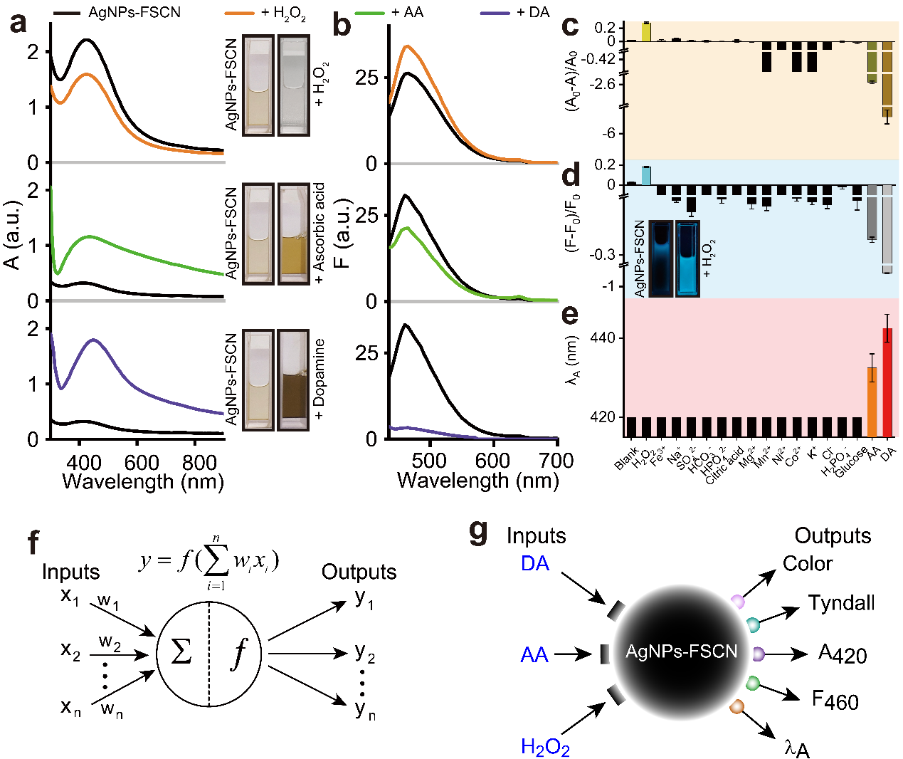 他们以废弃鱼鳞衍生的碳纳米颗粒(FSCN)为还原剂和稳定剂,通过直接和选择性催化Ag+为银纳米粒子(AgNPs),开发了一种简便、一步、温和、经济的银-碳纳米(AgNPs-FSCN)复合材料的制备方法。该复合材料具有先进的多功能性,显示出多维刺激响应能力(包括五个通道:颜色、廷德尔效应、吸收峰值强度和波长,以及荧光峰值强度),可用于重要生物分子(H2O2、抗坏血酸(AA)和多巴胺(DA))的多模多重检测以及高级信息处理和沟通。类似于生物感觉神经元,基于AgNPs-FSCN的系统具有可编程性和隐藏性,他们将其抽象为纳米神经元,实现了大规模并行分子逻辑计算和分子信息通信和安全(隐写术和密码术)。
