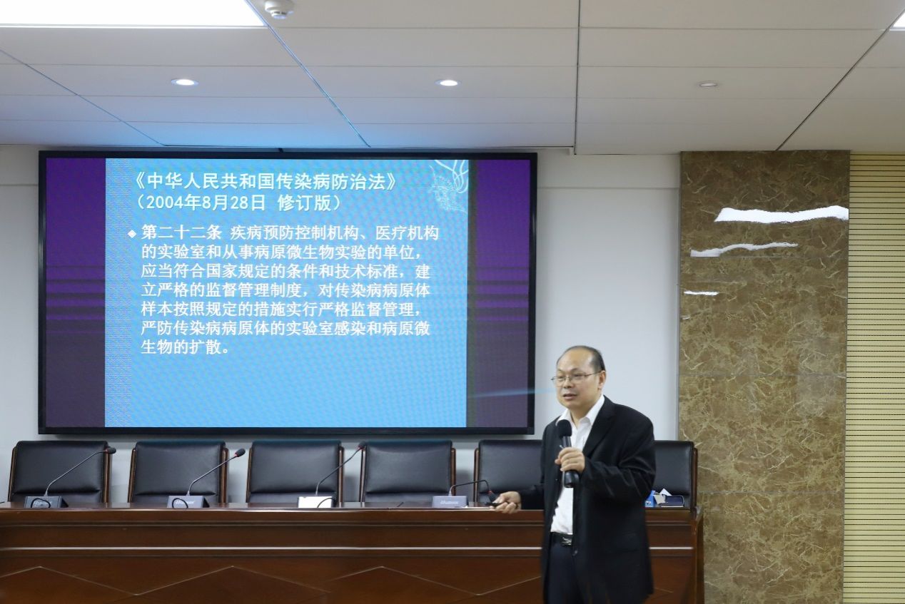 罗万才向同学们介绍了实验室生物安全的基本概念和重要性,并通过实例分析,为同学们讲解如何处理实验室中的生物安全事故。他指出实验室生物安全不仅关乎科研人员的身体健康,也关乎生态环境的保护和社会稳定。随后,李钢强解读了《实验室生物安全通用要求》、《病原微生物实验室生物安全管理条例》等法律法规,阐述实验室生物安全的预防、处理与防控方面的知识。