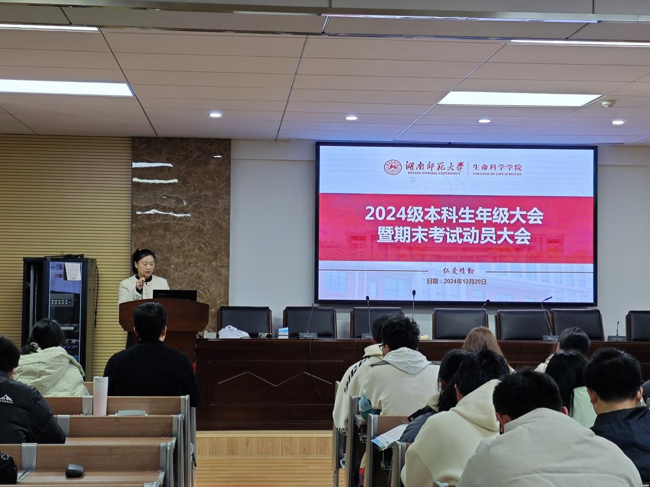 (通讯员 喻雪 吴德高)12月20日中午,生命科学学院2024级辅导员罗静伟老师在生科院三号楼B307报告厅召开2024级本科生年级大会暨期末考试动员大会,生科院24级全体同学参加此次会议。