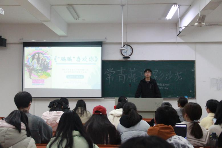 贾天成介绍此次观看的影片———电影《"骗骗"喜欢你》讲述了打工女孩林晴朗被前男友张子骏骗走钱财后,与行骗高手欧阳晖(孙阳饰)联手设局复仇的故事。影片以“反渣反诈”为主题,融入喜剧元素,同时采用双线叙事展现当代青年在困境中的自我救赎。观影结束后,主持人通过展示电影关键节点图片、结合人物特征与经典台词辨析角色关系、猜影片金句等互动环节,引导同学们回忆影片中内容,融入生活实际思考"利用与信任的边界"等现实议题。