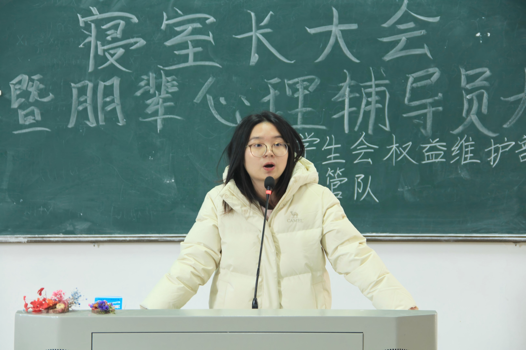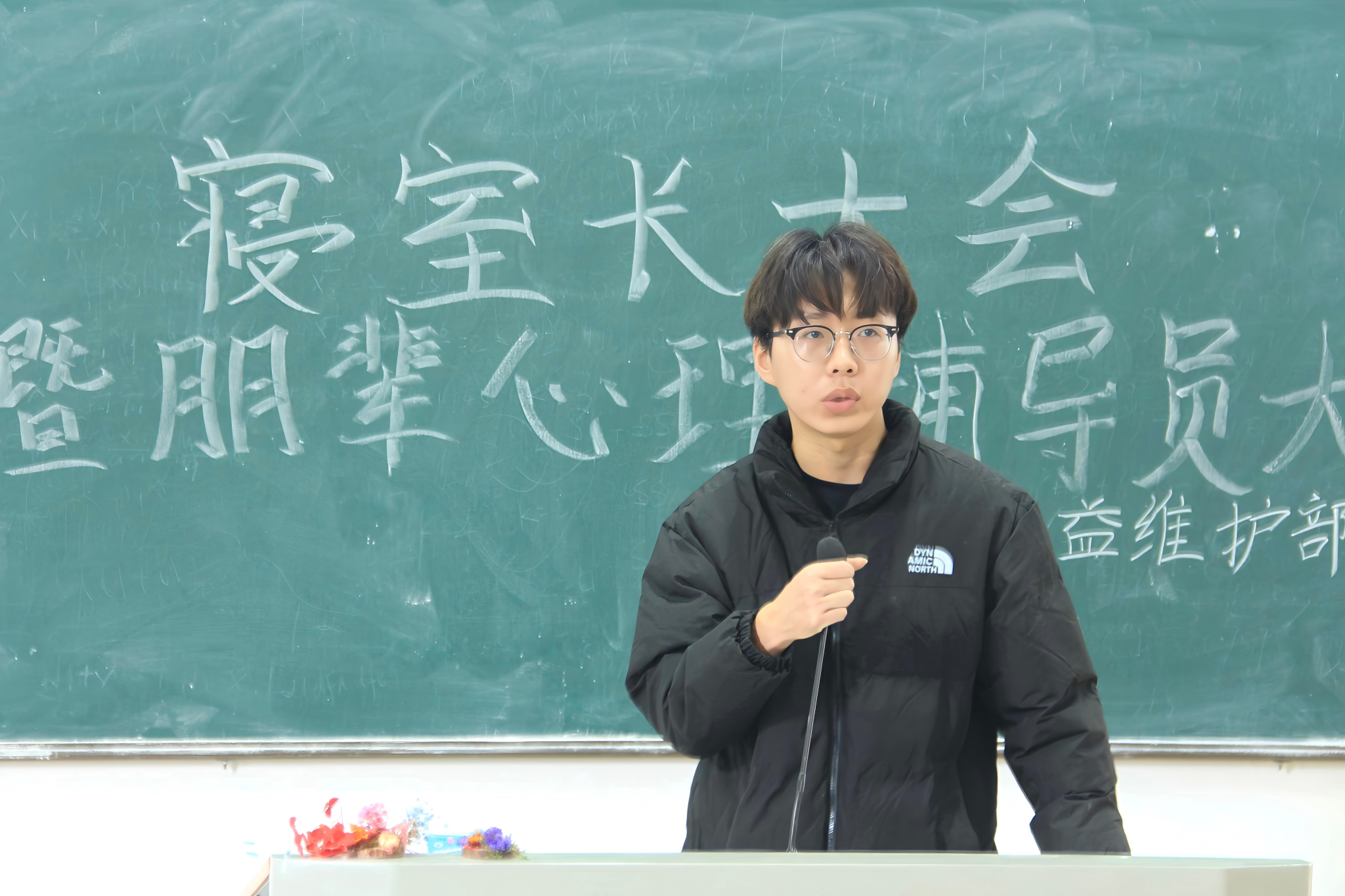 三位主讲人分别围绕不同方面展开阐述。刘迎彬分享两则学生心理危机处理案例,倡议大家强化责任意识,积极与身边同学沟通,密切关注他人心理健康;姚欣彤说明寝室长职能与重要性,讲解宿管队近期工作,明确卫检评分评优及学院奖金规则,并鼓励同学们共同维护寝室环境;贾天成介绍朋辈心理辅导员相关内容,展示心理健康微团辅活动,鼓励同学们积极参与,同时分享常青藤心理成长辅导室职能及线上线下咨询方式。