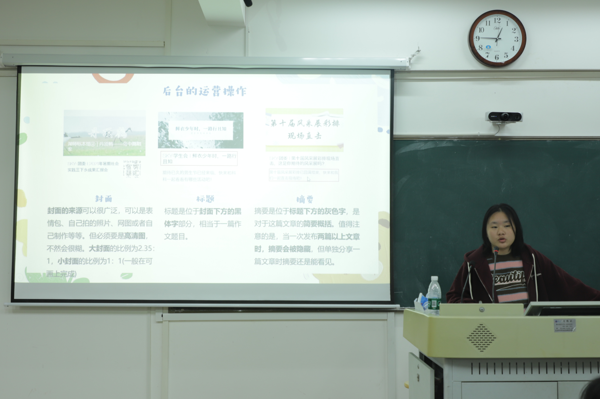 此次培训包括微推制作和公众号运营两个部分。第一位主讲人从微推制作工具的功能展开讲述,向学员们演示如何使用可画设计完成微推封面和往期推荐的制作,并进行具体操作指导。第二位主讲人向学员们讲解推送的组成部分,明确微信推送的基本要素包括主题、标题、文字稿和图片,并对如何利用秀米进行微推排版与格式编辑进行说明。第三位主讲人从公众号的后台操作和申请个人公众号的流程两个方面入题,向学员们介绍后台的运营界面和运营流程,并重点讲解公众号的封面、标题和摘要要求。