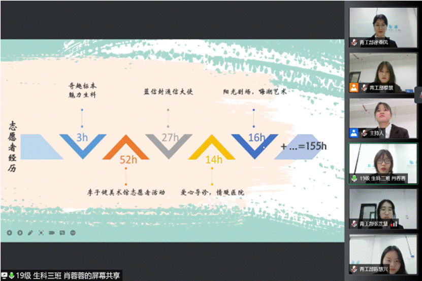 (通讯员 陈慧兴 蔡慧 徐春凤)11月21日晚,生命科学学院团委青工部于逸夫图书馆126研讨室举办“青春志愿,你我同行”线上宣讲会活动。生科院党委副书记彭赛丰、院团委书记兼2020级辅导员赵志浩、2019级辅导员李翠玲出席此次活动。校青工及各兄弟学院代表作为观摩团成员参加此次活动。院团委青工部干事李娟担任此次活动主持人,院团委学生副书记舒兰钧、院团委青工部第二负责人蔡慧及19级生科三班班长肖蓉蓉担任宣讲会主讲人。