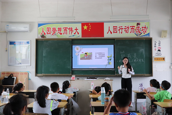 (通讯员 梁嘉怡)7月7日下午,为增强学生安全防范意识,提高学生的自我保护能力,生命科学学院团委赴岳阳市石牛寨镇暑期社会实践团在姜源学校举行安全知识讲座,队员郭英美担任此次活动主讲人。