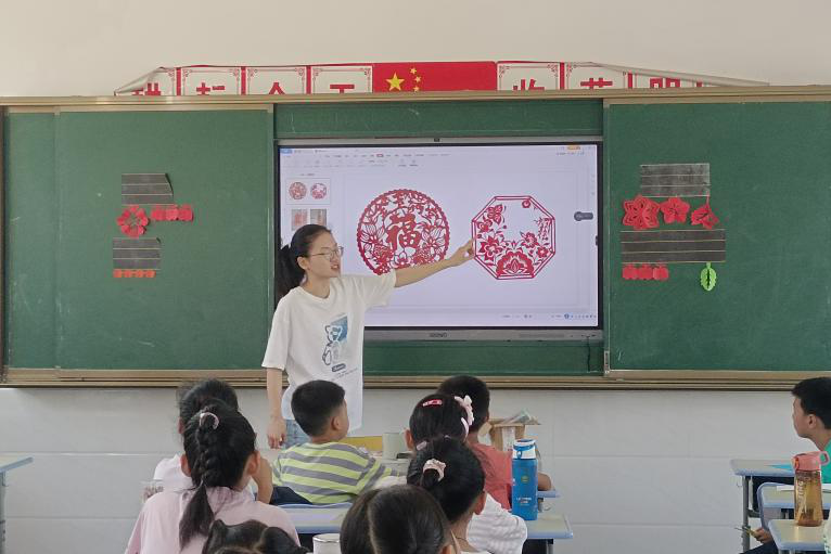 (通讯员 陈淑娟 朱新瑜) 7月17日上午,为锻炼学生的创造力和想象力,提高学生艺术修养,生命科学学院团委赴岳阳市石牛寨镇暑期社会实践团在姜源小学开展剪纸课程,饶瑶婷担任课程主讲人。