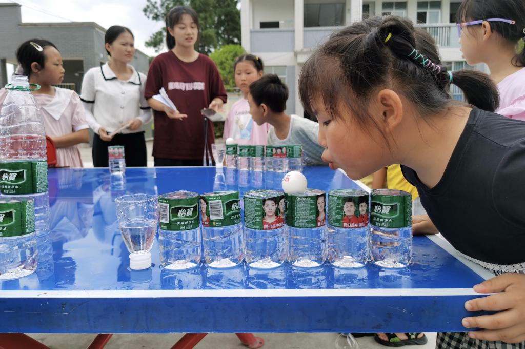 不同比赛项目考验着同学们不同方向的能力。吹乒乓球比赛考验肺活量大小和气息控制能力,同学们需要将乒乓球依次吹过七个装满水的瓶子,在保证乒乓球不掉落的情况下尽量缩短用时。投壶比赛则需要具备良好的控制力与平衡感,同学们站在规定距离之外,将签子投入前方的箱子内,每人五次机会,投中数量多者获胜。两人三足和双人夹气球接力比赛考验的是组队同学间的默契程度与协作能力,小组同学需配合完成比赛项目,用时短的小组胜出。