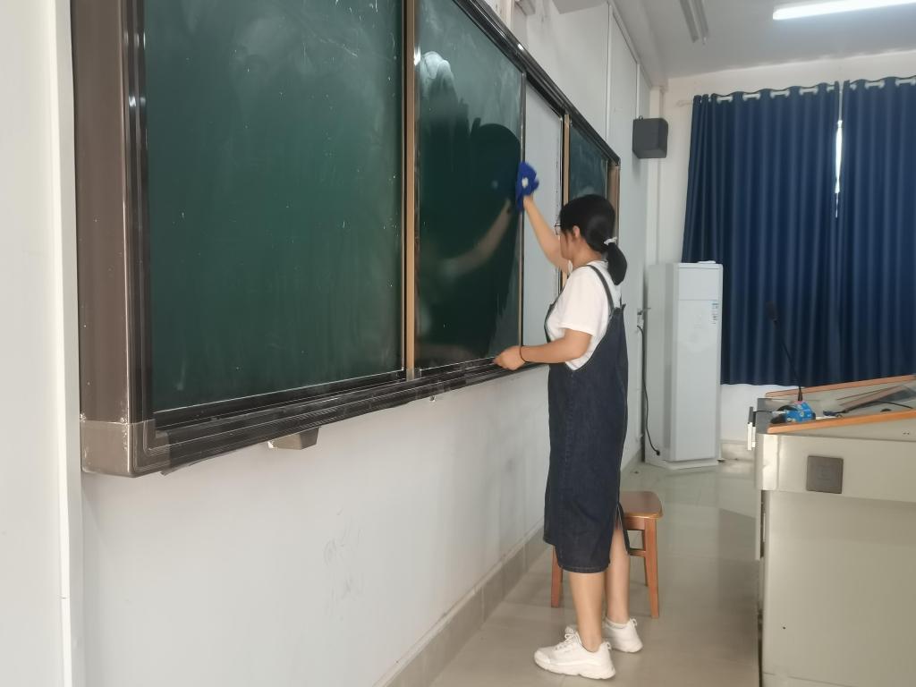 志愿者们集合并签到后,谌鑫怡讲解志愿活动内容。在志愿活动过程中,参与活动的志愿者们相互合作,共同完成了擦黑板、清理课桌里的垃圾、整理讲台以及扫地、拖地的劳动工作。