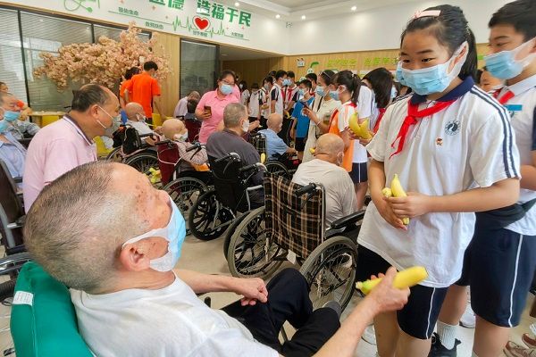图为麓山国际实验学校学生于咸嘉湖邻里养老中心与老人互动
