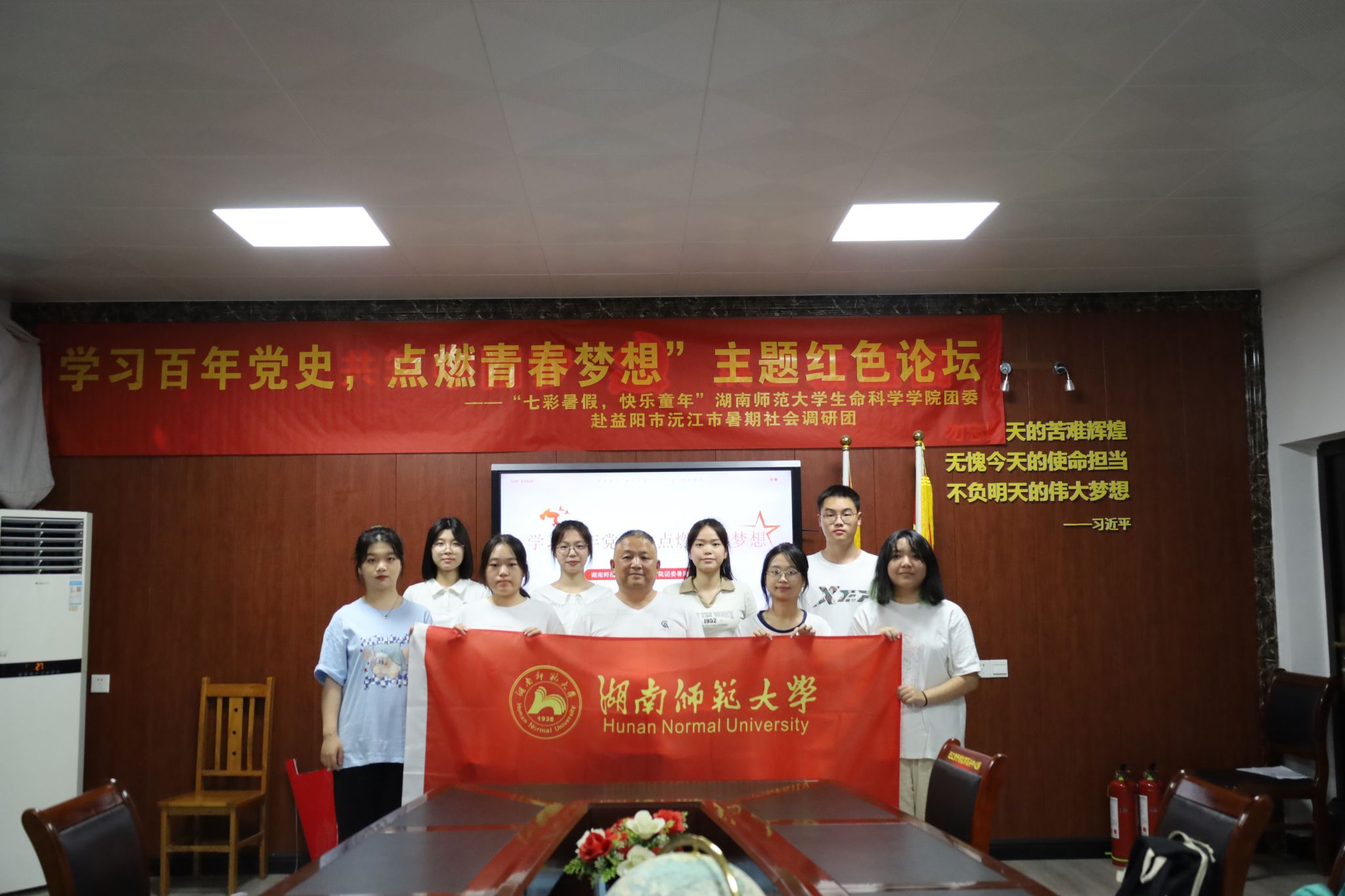 (通讯员 甘俊懿 李宇轩)7月14号上午,湖南师范大学生命科学学院团委赴益阳市沅江市暑期社会调研团调研组于莲子塘小学党支部办公室举办“学习百年党史,点燃青春梦想”主题红色论坛活动。莲子塘小学教师代表高丹担任主讲人,生科院团委暑期调研团队长张晰然担任发言人,队员甘俊懿担任主持人。