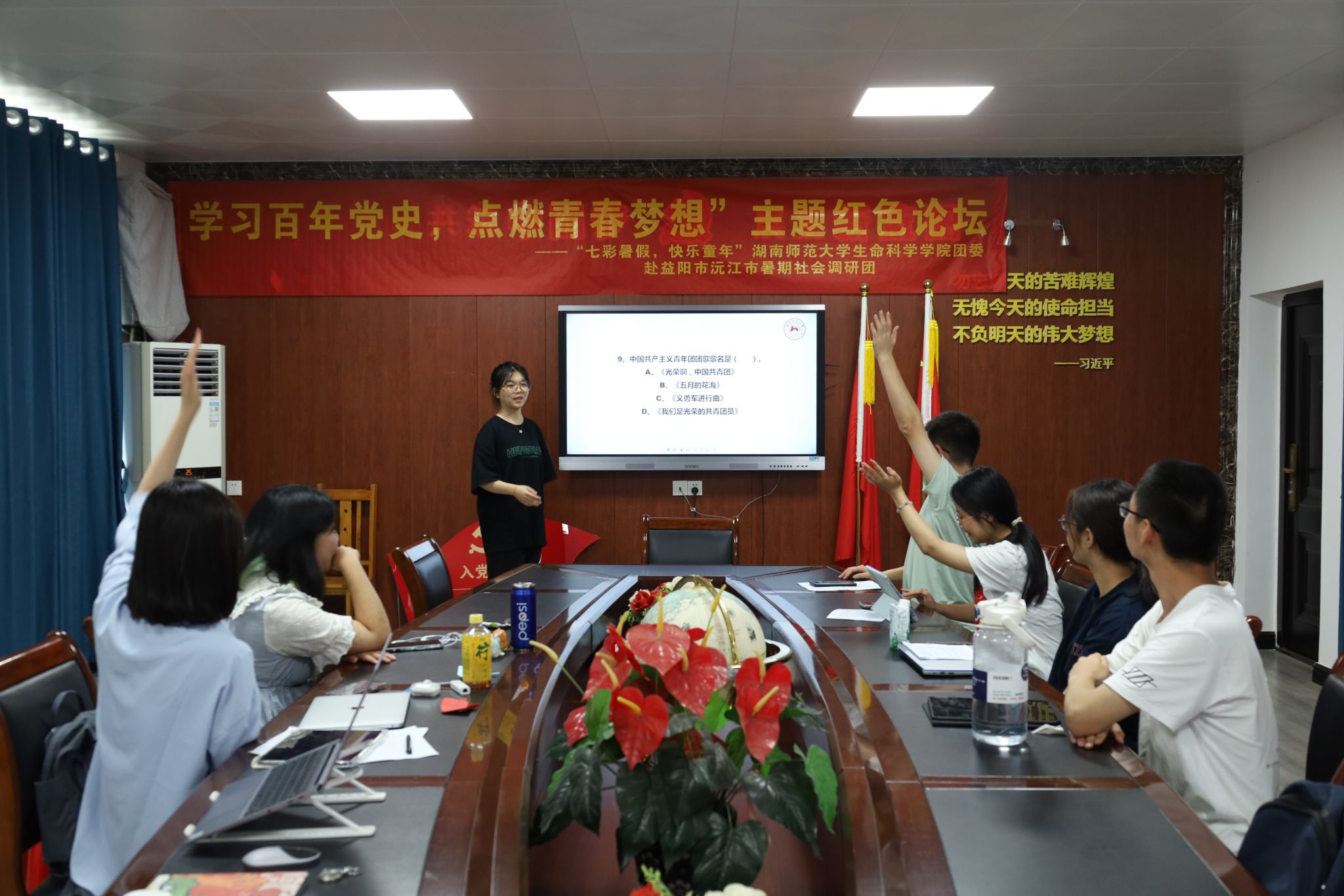 (通讯员 王芷祯 黄辰希 李宇轩)7月18日上午,湖南师范大学生命科学学院团委赴益阳市沅江市暑期社会调研团调研组举办“回顾红色团史,不忘初心使命”座谈会活动。调研组组长黄晨容担任此次座谈会的主讲人。