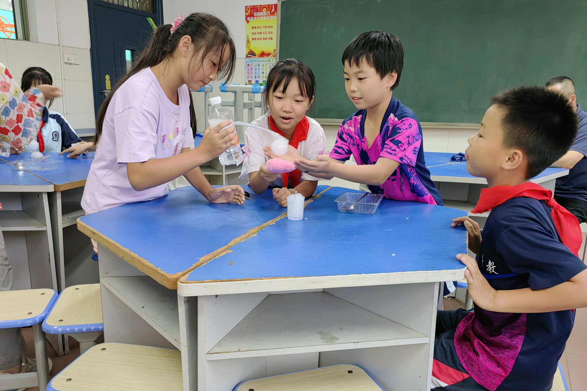 22级本科生刘珺瑶向小朋友们介绍了干冰的特点、制备方法以及其与常规物质的化学反应等知识内容,她利用实物、图片和视频等多种形式,向小朋友们展示了干冰的特殊性质和实验操作过程。在22级本科生刘依婷的协助下,小朋友们以小组的形式自主进行干冰实验。他们按照老师提供的安全指导和实验步骤,将干冰与其他物质进行混合或放入容器中,观察实验现象并记录下来,同时针对实验现象提出了自己的猜想。