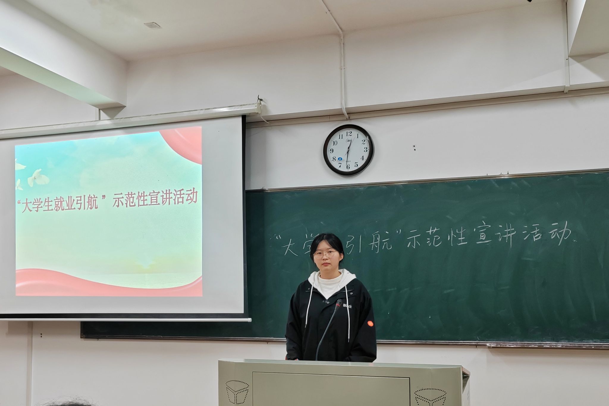主讲人从当前就业形势分析、树立正确的就业观和求职技巧三方面内容进行分享。主讲人表示,当前高校毕业生人数大,就业空间有限,同学们应树立“先就业,后择业”、“大专业就业”的观念,主动争取就业机会。她结合自身经验向同学们分享求职技巧,她表示求职简历内容要简洁精炼,凸显自身优势。她从着装、心理和技巧三个方面分享面试准备的基本要点,表示面试要做到着装得体,举止大方。同时,她与同学们一同分析面试五个经典问题,为同学们答疑解惑。随后,她鼓励同学们积极参加各类现场招聘会,积累面试经验。