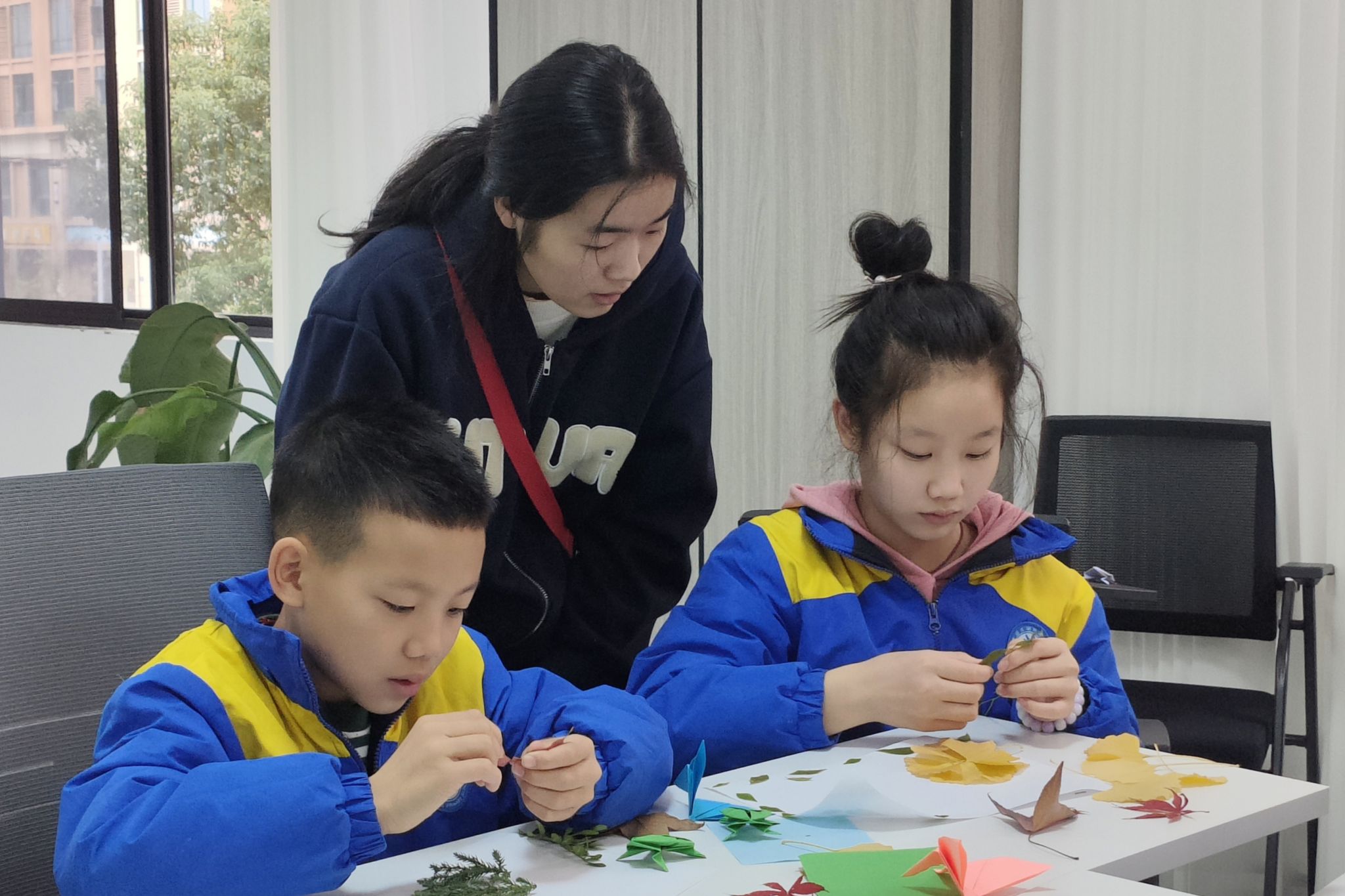 志愿者于活动开始前到达活动地点,引导小朋友们和家长按次序入座。熊逸冰利用纸蝴蝶作为引入,从昆虫的起源、昆虫的特征、昆虫的外骨骼三个方面展开课程,并讲述蝴蝶过冬的方式和益虫与害虫的分类。她讲解蝴蝶过冬方式包括以卵过冬、以幼虫过冬、以蛹过冬和以成虫过冬,害虫与益虫主要是根据它们对人类活动的害处或益处来划分的。刘星播放落叶制作贴画的视频,利用课件讲解制作步骤。志愿者们向小朋友分发落叶、A4纸和蜡笔,鼓励小朋友们利用落叶发挥想象力做画,同时,志愿者利用刷子和胶水帮助小朋友们固定落叶,协助小朋友们完成贴画制作。小朋友们互相展示创意作品,分享创作想法和理念。