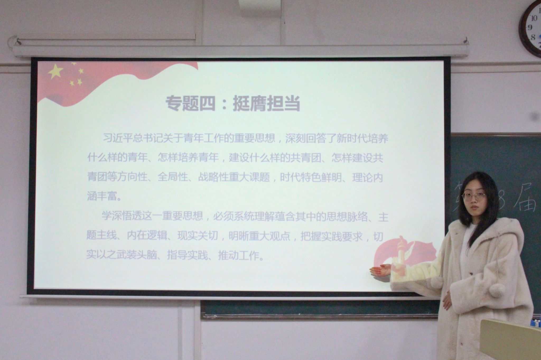 此次“面向广大团员和青年开展学习贯彻习近平新时代中国特色社会主义思想”主题教育活动分为四个专题,分别是思想旗帜、坚强核心、强国复兴和挺膺担当。在专题“思想旗帜”中,邱靖雯以习近平新时代中国特色社会主义思想为核心要义,带领生科院学生会全体成员展开学习研讨,帮助学生们不断增强对党创新理论的认同,提高思想觉悟。在专题“坚强核心”中,邱靖雯借习近平总书记的指导话语,说明我们要从思想上正本清源、固本培元,始终在思想、政治和行动上同党中央保持高度一致,拥护党的领导。在专题“强国复兴”中,陈淑娟表示我们应始终牢记习近平总书记的重要要求,以中国式现代化方针全面推进中华民族伟大复兴,团结奋斗,为“强国复兴”贡献青春力量。在专题“挺膺担当”中,方子瑜向学生会全体成员展示习近平总书记关于青年工作重要思想的内容。她表示,如果要学深悟透这一重要思想,必须明晰重大观点,把握实践要求。