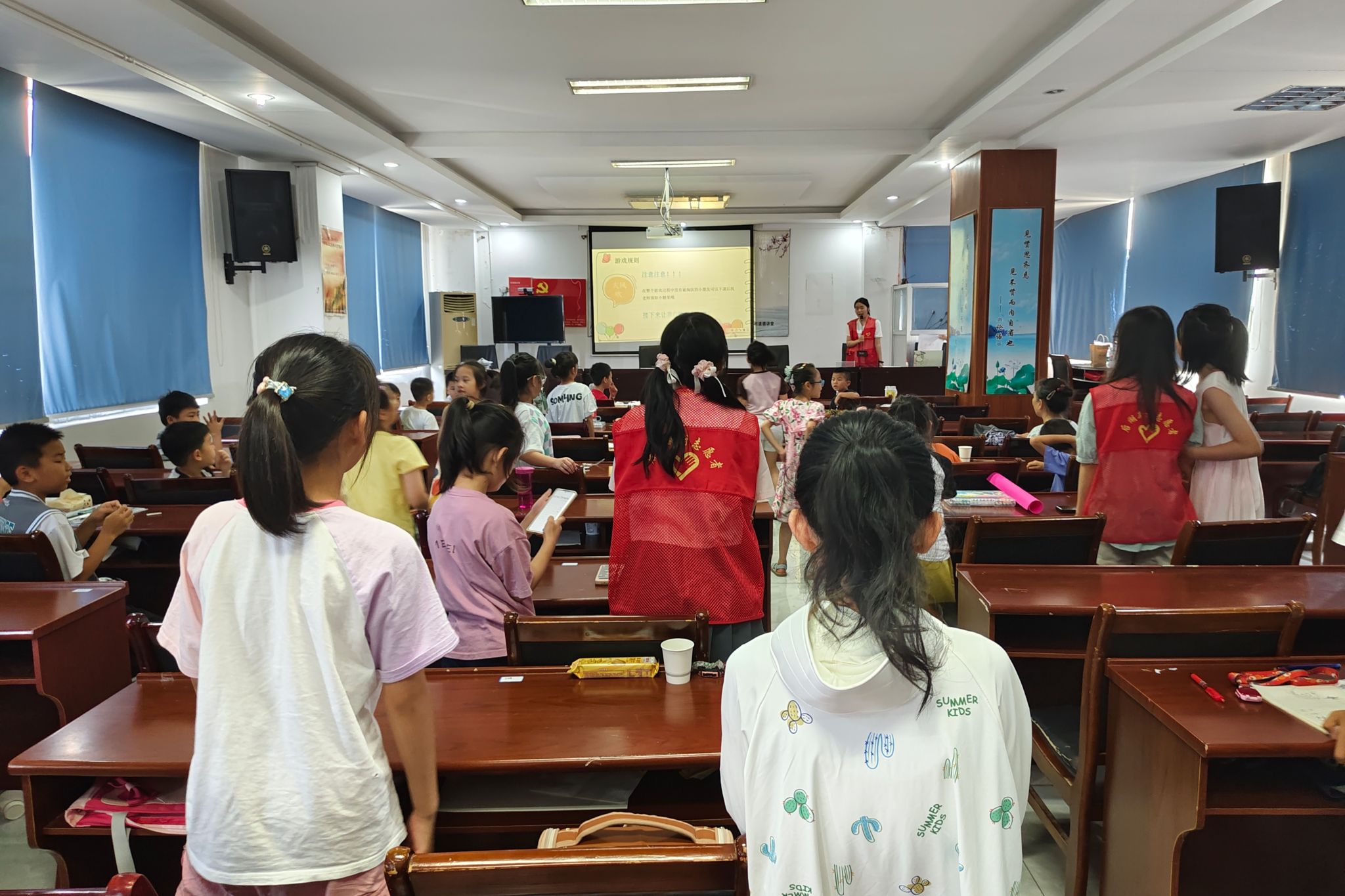 为促进课堂氛围活跃以及避免小朋友们久坐,第二位主讲人开展室内游戏课程。她通过PPT向小朋友们介绍“大风吹”的游戏规则以及奖品设置,并亲身示范游戏过程以帮助小朋友们理解游戏玩法。主讲人发布“戴眼镜的同学”等游戏口令,符合口令的小朋友们迅速起立,全程表现良好的小朋友获得奖品。小朋友们表示此次室内游戏课程不仅让他们收获了心灵上的满足与快乐,也使他们得到了思维与行为反应能力上的提升。