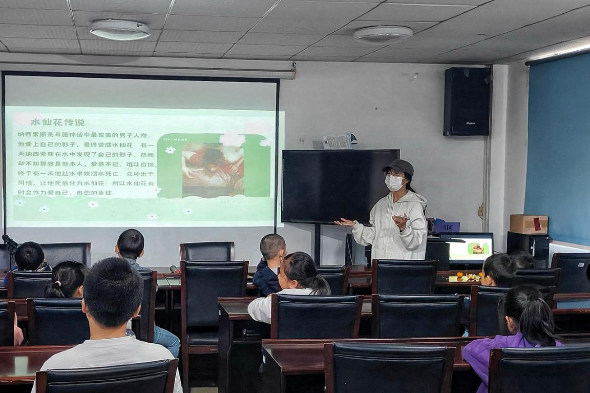 此次活动主要分为介绍水仙花相关知识和制作水培水仙花两个部分。贺橙子借助ppt和歌曲向小朋友们介绍水仙花的传说、外形、花语和栽培注意事项。例如,水培水仙花的水不能超过鳞茎的三分之一,前十几天要每天换水,栽培时不用特地施肥等。贺橙子解释水仙花鳞茎的汁水具有毒性,水仙花的气味也会使人产生中毒症状。同时,贺橙子以提问的方式与小朋友们进行互动并给予小奖品来提高小朋友的积极性。在实践部分,志愿者们为小朋友们分发了装有铺面石的咖啡杯作为水培容器,各种假花、贴纸、小海螺作为装饰和处理好的水仙种球,并协助他们完成水培水仙的制作。