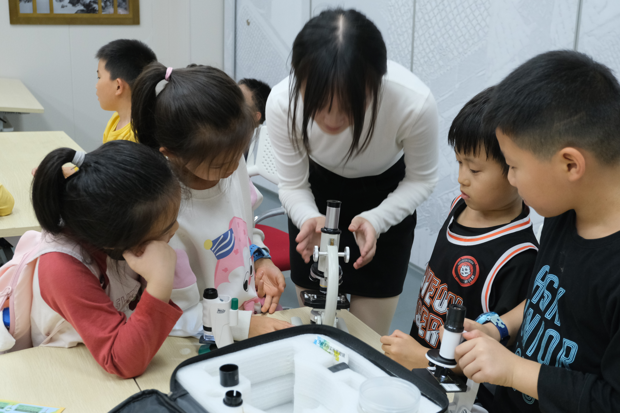志愿者带领小朋友观察植物细胞切片