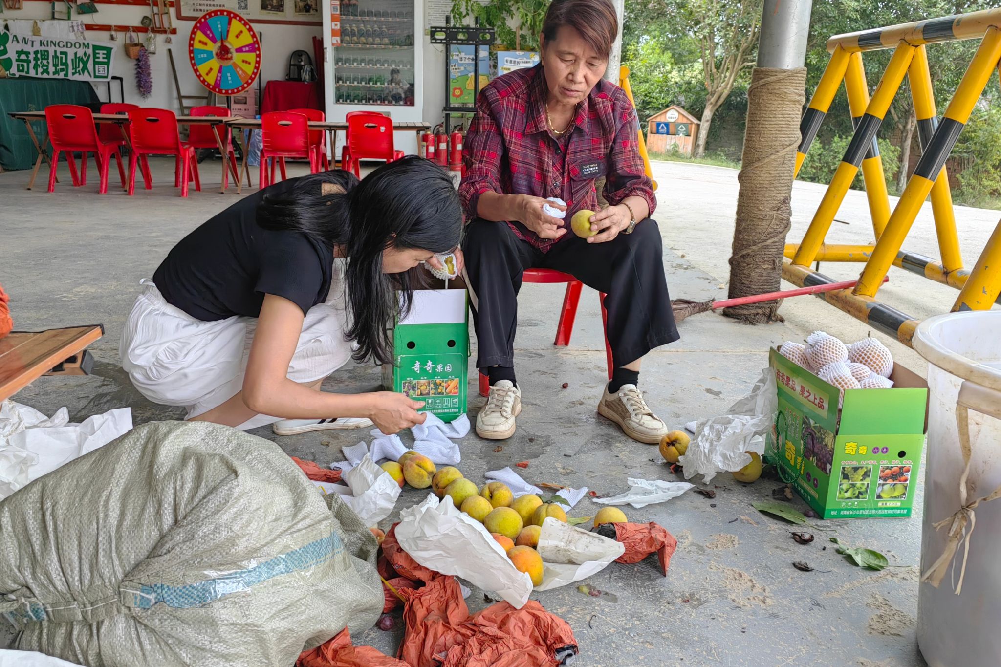奇奇果园基地水果种类丰富,以梨子、桃子、葡萄为主。在采摘之前,团队成员进行了前期的培训,学会如何分辨熟果好果以及如何采摘不伤果等基本采摘知识。在果农的指导下,实践团成员们迅速掌握了摘果技巧,并通过分工合作,将大小合适的熟果采摘挑选装箱。采摘后的水果搬运到打包场地后需进一步筛选,有瑕疵的烂果坏果会被挑选出去,以保证果园基地销售水果产品的质量。同时,不同大小和品质的水果将会被分选到不同的盒子里以作区分。