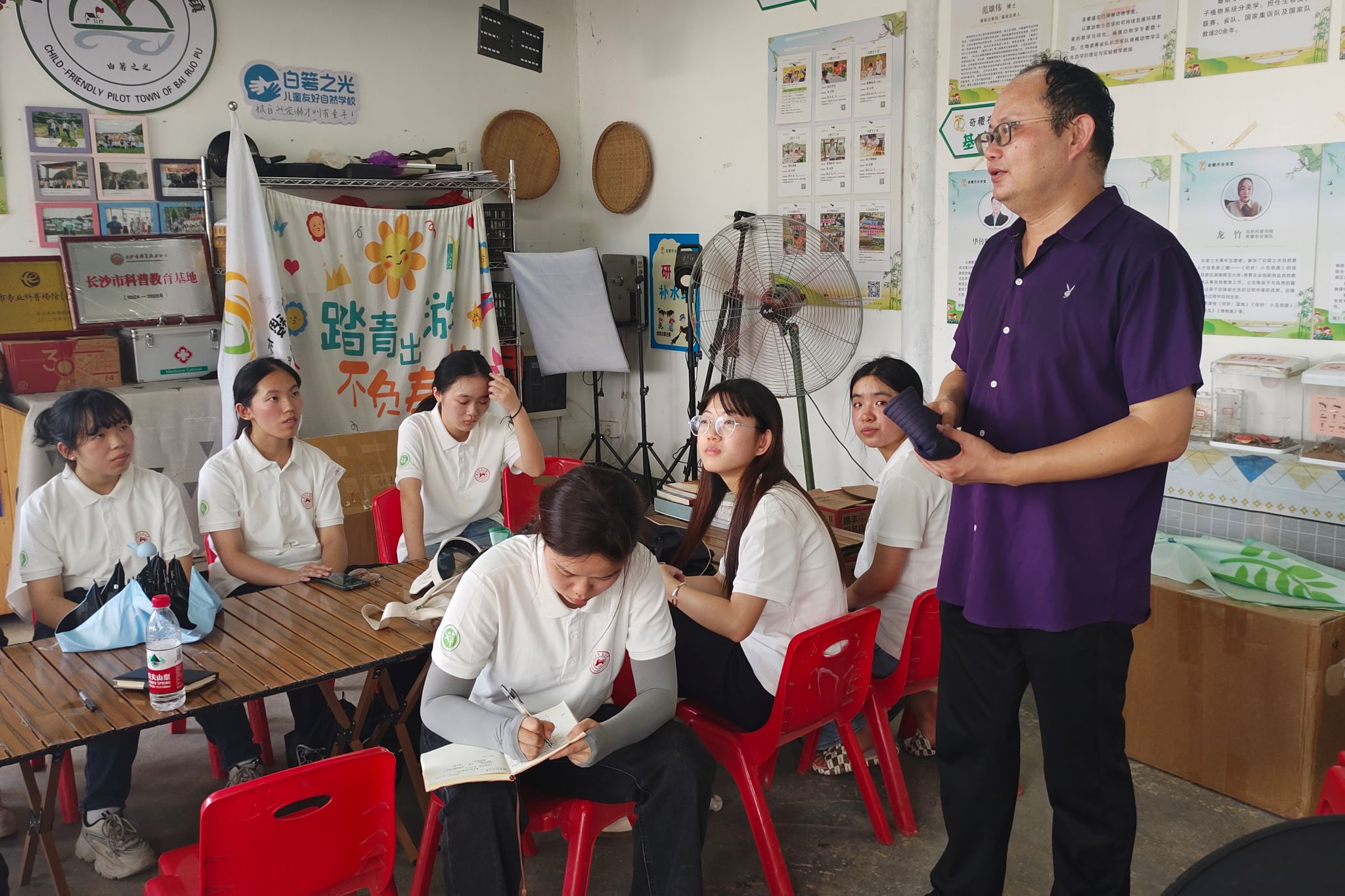 活动前期,范雄伟协调主办方与实践队之间的沟通,确保双方顺利对接,并带领实践团成员到达实践基地。基地人员对实践团队伍表示欢迎,并与范雄伟带领实践团成员熟悉当地环境、建设历史与宿舍条件,帮助大家初步了解当地的整体情况。团队成员在果园内召开动员大会,在范雄伟的指导下明确队伍的活动目标与任务分工,探讨活动内容与活动流程,力求确保每项工作都有条不紊地推进。范雄伟指出,各个小组应协调推进不同工作开展,教学组负责设计与搭建昆虫馆并研发科普教育课程,在确保安全的同时激发孩子们的自然兴趣;调研组负责活动调研与故事挖掘;后勤组负责确保活动场地的布置、物资的供应以及参与者的饮食安全;宣传组则需要通过各种渠道,将活动信息广泛传播,吸引更多人的关注和参与。
