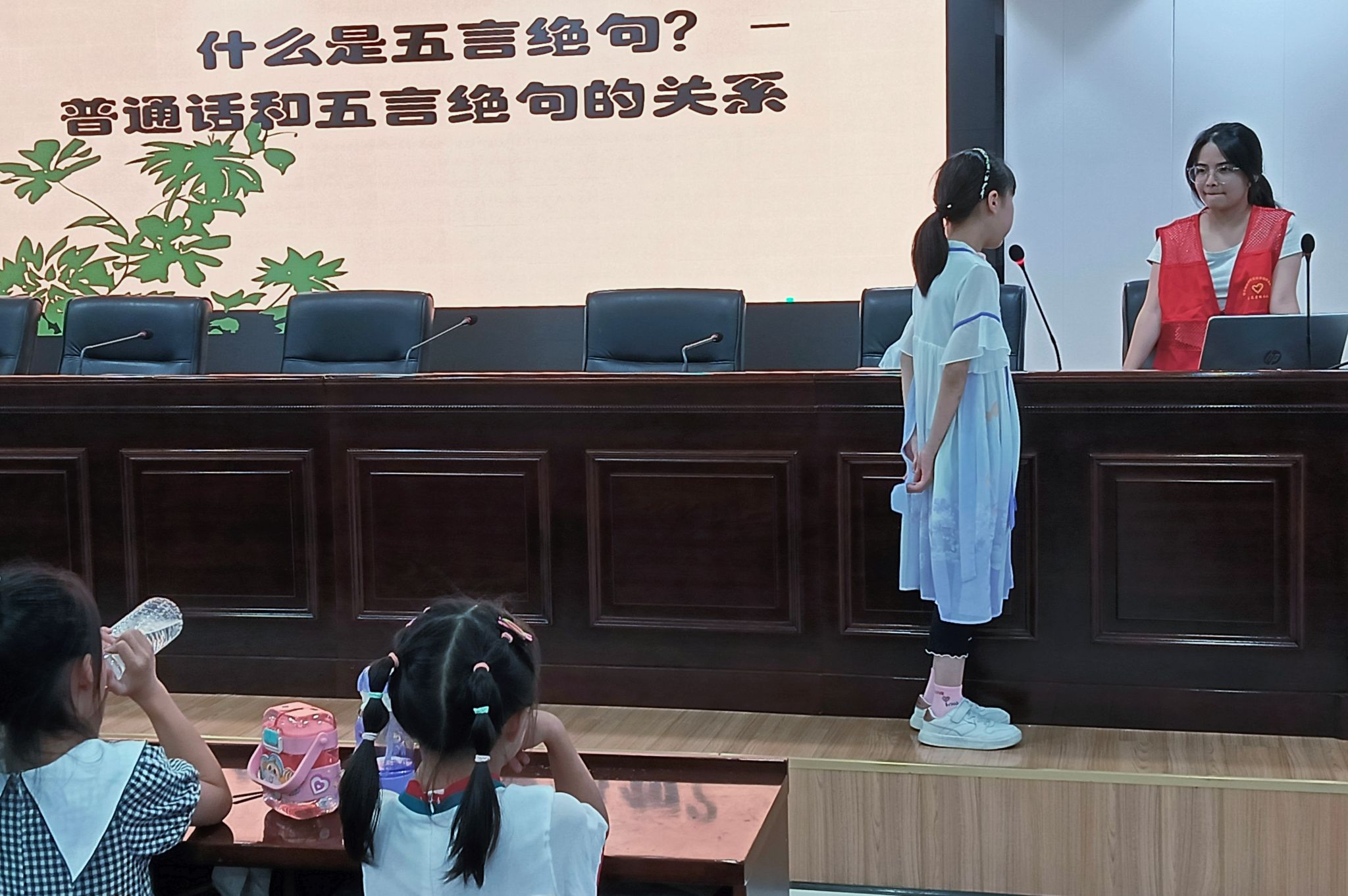 主讲人向学生们系统讲解五言绝句的相关知识。她明确指出,五言绝句是由四句构成、每句五字的诗歌体裁,并详细阐释其基本结构。同时,主讲人介绍了押韵的定义,阐明押韵在五言绝句中的作用。为加深学生们的理解,主讲人带领大家一同朗读经典五言绝句,及时纠正学生在朗读中出现的发音问题,引导他们饱含情感地诵读诗歌,学生们均积极参与该环节。此外,主讲人通过播放趣味视频的方式,让学生认识到学习普通话的重要意义。她借助绕口令互动环节,激发学生对说好普通话的兴趣,引发他们对普通话学习的深入思考。