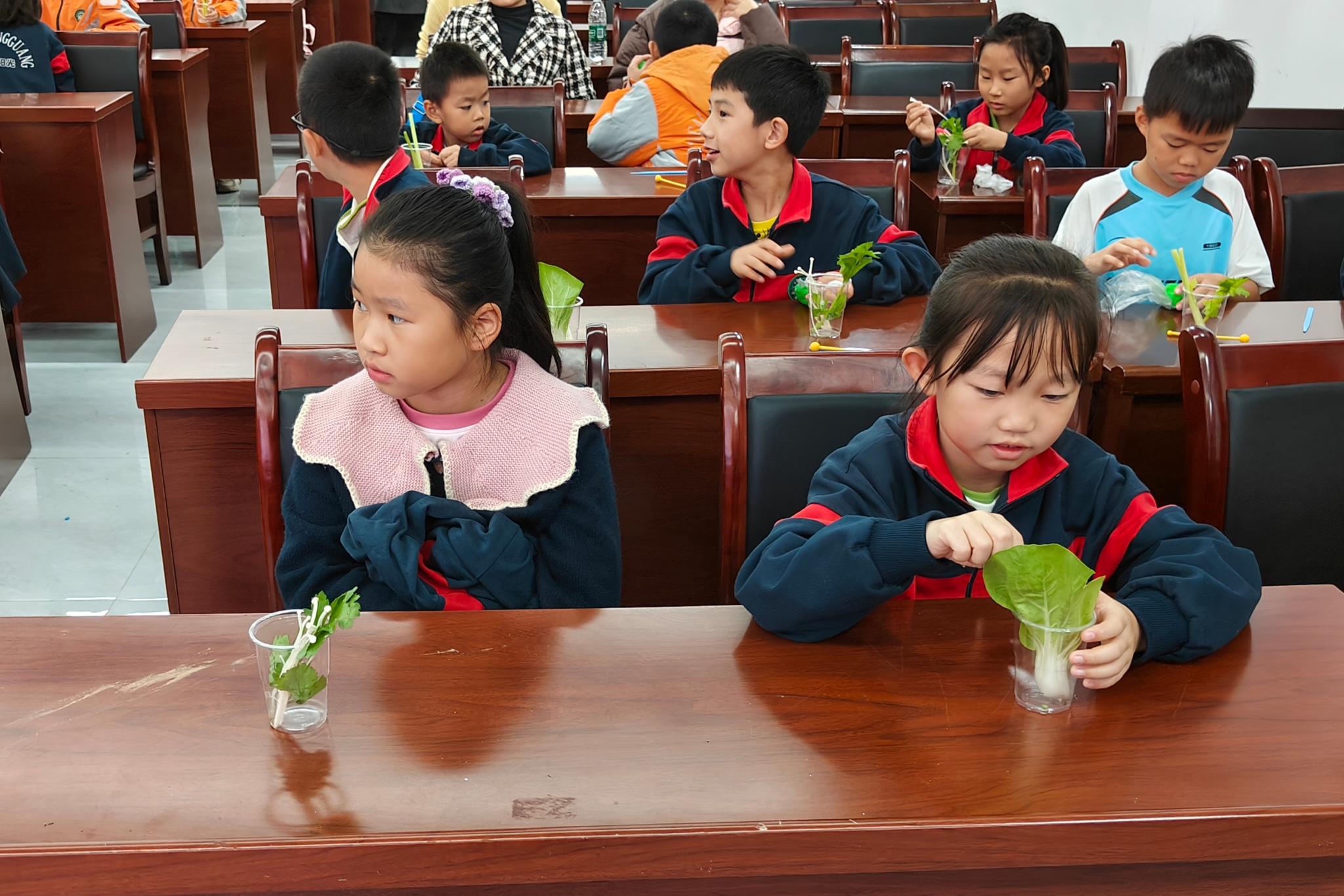 此次活动围绕叶脉的结构功能、运输观察实验、成果分享及总结四个环节展开。主讲人巧用比喻切入主题,通过具象化展示叶脉层次结构与不同类型,帮助小朋友快速掌握其“运输养分、支撑叶片、传递信号”的多重作用。同时主讲人以提问引导思考,充分激发小朋友的探索好奇心,增强互动性。实验环节,志愿者为小朋友分发杯子、色素、白菜叶等材料。经过动手实践,小朋友们观察到水分沿植物叶脉向上运输的动态过程。小朋友们画下叶脉运输路径,深化对植物叶脉运输的理解。