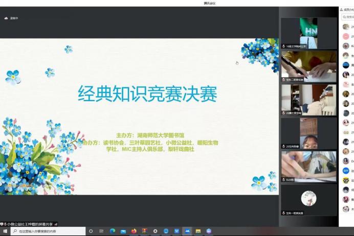 (通讯员 黄依文 郭英美)5月28日下午,生命科学学院读书协会、暖阳生物学社、三叶草园艺社、达人学社、小微公益社、湖南师范大学图书馆、文学院梨轩戏曲社与新闻与传播学院MIC主持人俱乐部于线上举办湖南师范大学第三届麓山阅读马拉松挑战赛第四程活动“经典知识竞赛”。小微公益社理事王梓楹担任此次活动主持人。