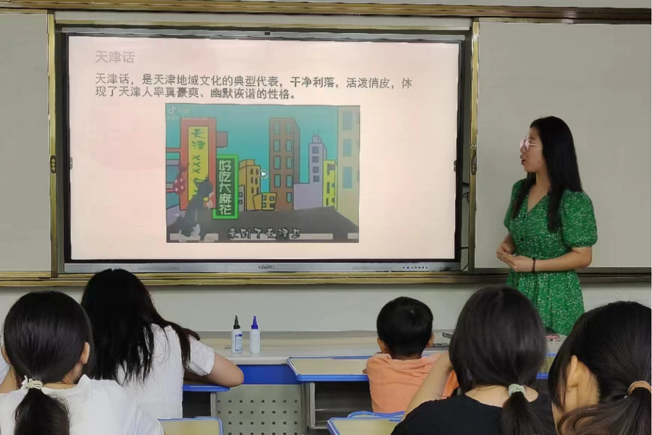 高天雅展示并介绍了各地具有代表性的方言,引入推广普通话的主题,她向同学们讲解了普通话的发展过程,并将方言的与普通话做对比。为帮助同学们深入思考为什么要学习普通话的问题以及推广普通话与保护方言之间是否存在冲突,高天雅播放了普通话推广宣传片,并向同学们解答了以上问题。学生们了解过后开始进行普通话朗读的尝试和绕口令大比拼。