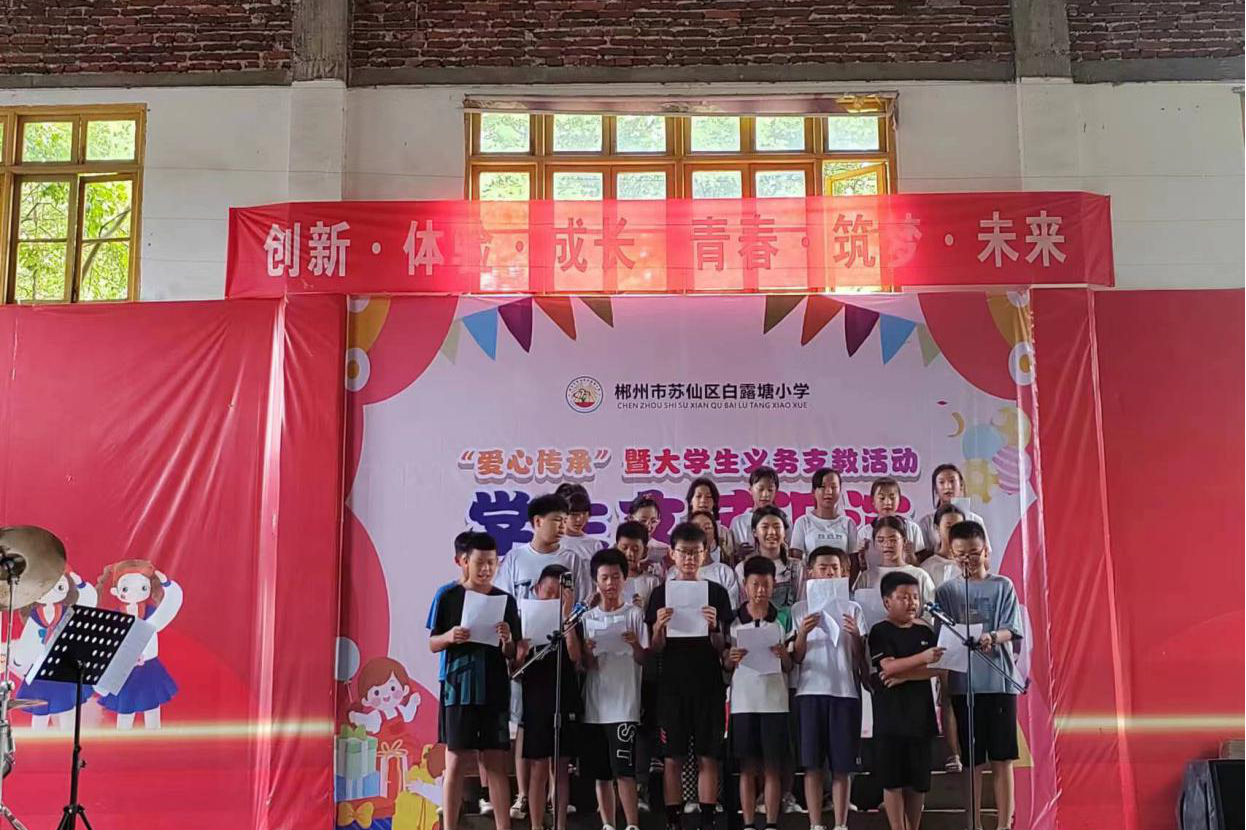 (通讯员 王芷彤)7月27日,生命科学学院三叶草园艺社“凝聚星火,暖心助学”暑期社会实践团于郴州市苏仙区白露塘中心完小举办文艺汇演活动。白露塘小学校长首林峰,李吉斌出席此次活动,实践团成员曹仕伟、朱婕担任此次活动主持人。