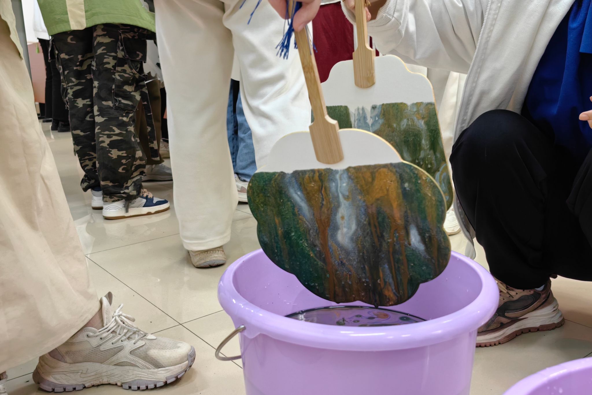 此次活动包括漆扇文化背景介绍、手工创作和成果展示三个环节。李超然向同学们介绍漆扇的文化背景及制作方法,她解释漆扇是一种古老且独特的中国传统手工艺品,结合了绘画、雕刻、镶嵌等多种艺术手法,制作过程包括选材、制扇骨、上漆、镶嵌和烘干五个步骤。同学们在主讲人的带领下,利用扇骨、扇面和漆料等材料,结合想象力漆扇并利用竹签轻轻吹动,让漆液在扇面上流淌、扩散,形成纹路和图案。同学们将作品进行分享展示,交流漆扇创作的心得和体会。